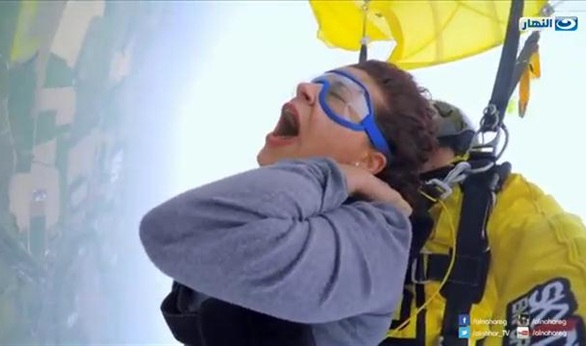 ومع اقترابها من الأرض وهي برفقة الرجل المتخصص في القفز يفاجئها بوجود باراشوت احتياطي معه ولكن بعد أن تكون قد توهمت بأنها اقتربت من توديع الحياة.