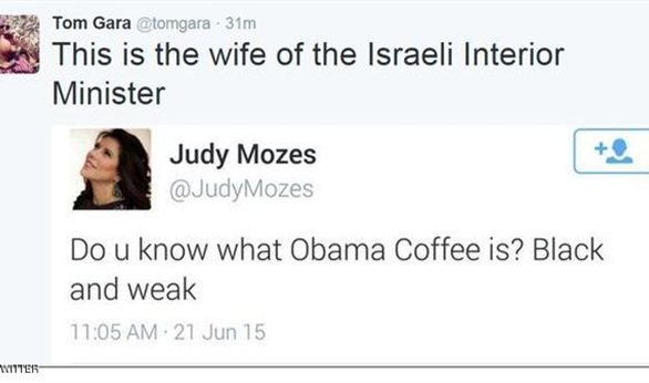 كتبت زوجة وزير الداخلية الإسرائيلي سفان شالوم نكتة على صفحتها في موقع تويتر، تناولت لون الرئيس الأميركي باراك أوباما ووصفته ضمنا بالرجل الضعيف، قبل أن تعود وتعتذر بعدما أدركت أنها قد تتسبب في مشكلة كبيرة.