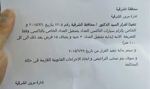 اكد مصدر بادارة مرور الشرقية بانه تم التنبيه علي رجال المرور بتعريف سائقي التاكسي بضرورة الالتزام بقرر الدكتور رضا عبدالسلام محافظ الشرقية رقم 2205 بتاريخ 1-3 لسنة 2015، والذى ينص على إلزام سيارات التاكسى العداد، بتشغيل العداد الخاص بالتاكسى وفقا للتعريفة الجديدة حيث يبدء تشغيل العداد ب3 جنيهات، ويضاف 15 قرشا بعد ذلك إلى كل 100 متر، وسوف يتم تنفيذ القرار بداية من 29 من يونيو الحالى، وسوف يتم سحب التراخيص من السائقين فى حالة عدم الالتزام.