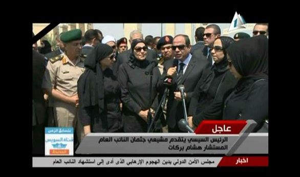 وقال السيسي خلال مشاركته بانفعال، "أقول لكل المصريين إن المستشار هشام بركات سقط لكي تعيش مصر، فنحن نواجه حربا ضخمة وعدوا خسيسا يحتاج مننا كلنا نقف كلنا مع بعضنا".