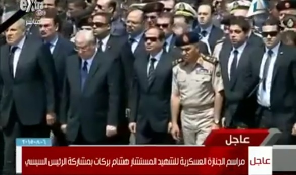 وشارك في تشيع جثمان المستشار هشام بركات إلى مثواه الأخير بمدافن الأسرة بالمقطم، الرئيس عبد الفتاح السيسي والمهندس إبراهيم محلب، رئيس مجلس الوزراء، والمستشار عدلي منصور، الرئيس السابق، وعدد من كبار المسئولين بالدولة.
