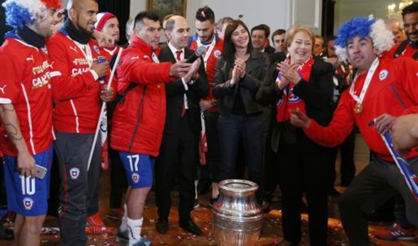 التقت الرئيسة التشيلية ميشيل باشليه صباح اليوم الأحد في قصر لامونيدا الرئاسي بالعاصمة سانتياجو، لاعبي منتخب تشيلي عقب الفوز ببطولة كوبا أمريكا لكرة القدم التي أقيمت على أرضهم.