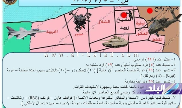 حيث تم قتل241 إرهابيا وضبط 4 أفراد فرد مطلوب أمنياً و29 مشتبه به وتدمير 26 عربة خاصة للعناصر الإرهابية منهم 11 لاندكروزر و10 تايلاندى منهم واحدة مفخخة – عربة (فيرنا) – (4) ربع نقل ].