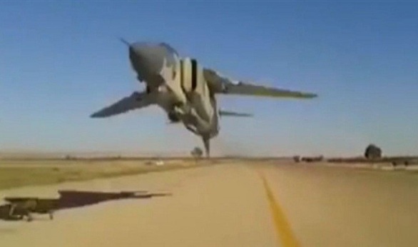 وصورت اللقطات الجنونية في قاعدة جوية بالبلد الذي مايزال يشهد اضطرابات ويعاني من حرب أهلية منذ عام 2011، وظهرت طائرة "ميج 23" السوفيتية الصنع، فجأة وهي تجتاز المصور وغيره من المتواجدين بالمكان، مع صوت هدير هائل وهي تنطلق فوق الأرض ببضعة أقدام قبل أن ترتفع إلى السماء.