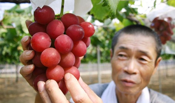 بيع عنقود من العنب اليوم، الجمعة، بسعر قياسي بلغ مليون ين (7460 يورو) أي 287 يورو للحبة الواحدة في اليابان، البلد الشغوف بالفاكهة الفاخرة.