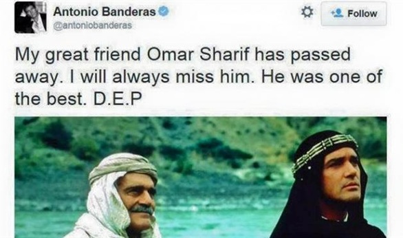 وكتب بانديراس علي صورة قائلا": "صديقي العظيم عمر الشريف توفاه الله، سأفتقدك".