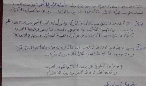 تقدم 6 من أعضاء هيئة مكتب حزب مستقبل وطن أمانة البحر الأحمر ، باستقالتهم المسببة حيث أرسلوها لرئيس الحزب محمد بدران .