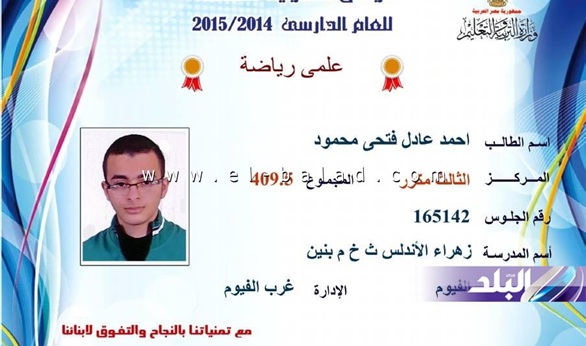 صرح المهندس محمود ابوالغيط وكيل اول وزارة التربية والتعليم بالفيوم بأن الفيوم حصدت ثلاثة مراكز متقدمة على مستوى الجمهورية فى أوائل الثانوية العامة وهم أحمد عادل فتحى الثالث مكرر على مستوى الجمهورية شعبة الرياضيات مدرسة زهراء الاندلس ، ونانسي عبدالرؤف الخامس مدرسة الثانوية بنات علمى علوم ، و اسراء مصطفى كمال الخامس مكرر مدرسة عين شمس علمى علوم على مستوى الجمهورية.