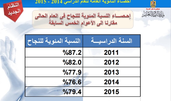 وأوضح الرافعي، أنه بلغت نسبة النجاح في نتيجة الثانوية العامة في عام 2015 (79.4%)، بينما بلغت العام الماضي (76.6%)، وفي عام 2013 بلغت نسبة النجاح في نتيجة الثانوية العامة 77.9%.