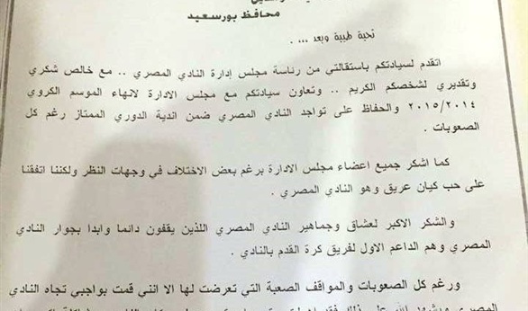 اتقدم لسيادتكم باستقالتي من رئاسه مجلس ادارة النادي المصري مع خالص شكري وتقديري لشخصكم الكريم وتعاون سيادتكم مع مجلس الاداره لانهاء الموسم الكروي والحفاظ على تواجد النادي المصري ضمن اندية الدوري الممتاز رغم كل الصعوبات.