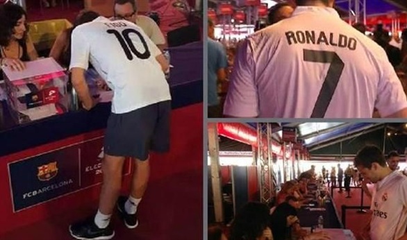 فاجأ عضوان في نادي برشلونة الجميع بارتداء قميصي ريال مدريد أحدهما يحمل الرقم (10) واسم البرتغالي لويس فيغو وأخر يحمل الرقم (7) والبرتغالي كريستيانو رونالدو خلال عملية التصويت لاختيار الرئيس الجديد.