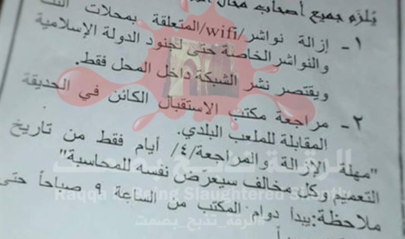 ويلزم التعميم - الذي قال ناشطو الحملة إن التنظيم قام بنشره في الرقة - أصحاب مقاهي الإنترنت بإزالة أجهزة توزيع الإنترنت "النواشر"، بما في ذلك تلك الخاصة بمقاتلي التنظيم والاكتفاء بتوفير خدمة الإنترنت داخل المحلات فقط.