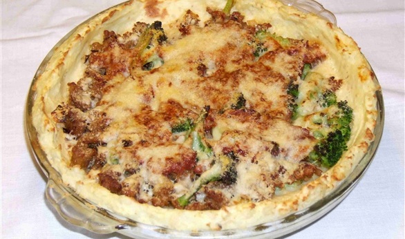 - في نفس الأثناء، يوضع السجق في مقلاة أخرى على نار متوسطة بدون إضافة دهون ويقلب بخفة لحوالي 5 دقائق ثم يرفع عن النار ويرفع خليط الخضروات عن النار ويضاف إليه السجق والجبن وتقلب مكونات الحشو بخفة ثم قومى بملء وعاء الفرن المبطن بالعجين بكمية مناسبة من الحشو يخبز العجين بالفرن لحوالي 30 دقيقة أو حتى تمام نضج الخبز والحشو ثم يترك ليبرد قليلا .