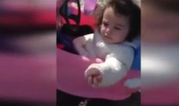 ويظهر في الفيديو طفلة لم تتجاوز العامين تقود سيارتها الصغيرة في الشارع، حاملة في إحدى يديها كوباً من الحليب، بينما تضغط على بوق السيارة، فيضبطها والدها القادم من العمل مطالباً إياها بالتوقف.