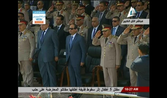 وقف الرئيس عبدالفتاح السيسي، ووزير الدفاع صدقي صبحي لتحية طلاب معهد ضباط الصف، وذلك أثناء مرورهم لتقديم عرض الأعلام الخاص بالكلية حاملين أعلام مصر والقوات المسلحة.