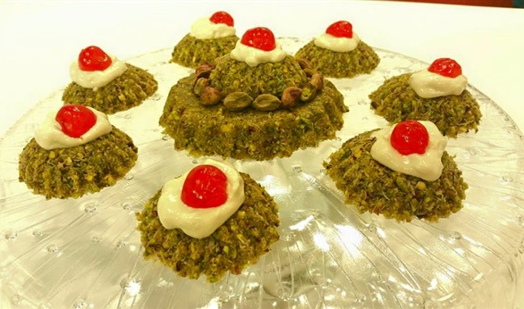 اطحني الفسدق ثم ضيفي الكنافة واطحني جيدا ضيفي ماء الورد وماء الزهر والشربات والسكر واخلطيهم وضعي المفروكة في قوالب سيليكون واقلبيها في طبق التقديم وزينيها بالقشطة والكريز والفسدق وقدميها باردة.