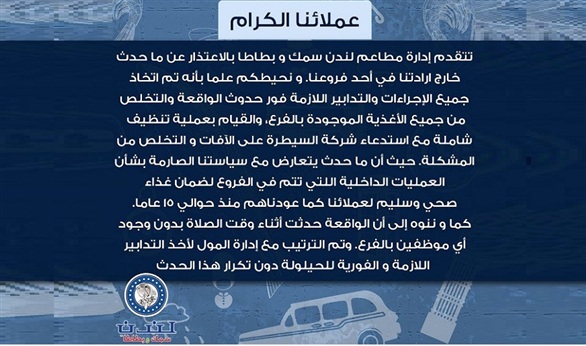 وتداول مغردون بياناً لإدارة المطعم يتضمن اعتذاراً عن الحادثة، والتي أكدت إتلاف جميع الأطعمة واتخاذ جميع الإجراءات الصحية اللازمة لضمان عدم تكرار الحادثة، ولم يتم التأكد من صحة البيان من مصدر مستقل.