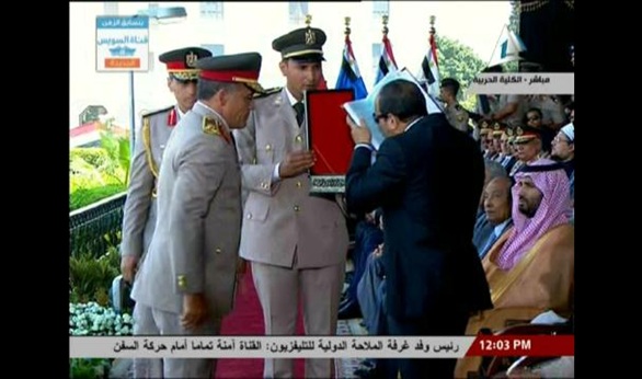 وكان في استقبال الرئيس السيسي المهندس إبراهيم محلب، رئيس مجلس الوزراء، والرئيس السابق المستشار عدلي منصور، الأمير محمد بن سلمان بن عبد العزيز ولي ولي العهد السعودي النائب الثاني لرئيس مجلس الوزراء وزير الدفاع، ووزير الدفاع الأسبق المشير محمد حسين طنطاوي والفريق أول صدقي صبحي، وزير الدفاع والإنتاج الحربي القائد العام للقوات المسلحة، والفريق محمود حجازي، رئيس أركان حرب القوات المسلحة، وقادة الأفرع الرئيسية ومدير الكلية الحربية، حيث عزفت الموسيقات العسكرية السلام الجمهوري لجمهورية مصر العربية.