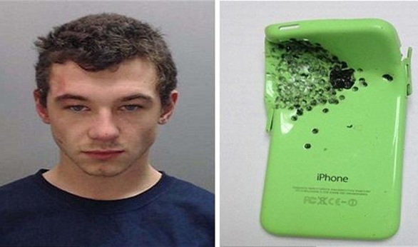 تعرض دانيال كندي (25 عاما) لإطلاق النار بعد شجار مع ريان دوغان (19 عاما) والذي كان أحد أعضاء عصابة ترعب السكان في منطقة وادينز بمدينة تشيشاير البريطانية، إلا أن إصابة كيندي لم تود بحياته إذ تلقى هاتفه من نوع آي فون الطلقة وحماه من الموت المحتم وفقا لما نشرته صحيفة ديلي ميل البريطانية.