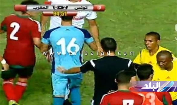 وأشهر حكم اللقاء البطاقة الحمراء لأحد لاعبى المنتخب المغربي إثر التحامه بعنف مع أحد لاعبى المنتخب التونسي قبل إطلاق صافرة نهاية المباراة.