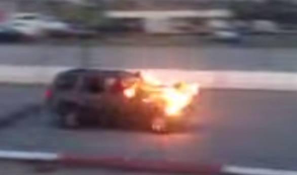ويظهر المغامر وهو يجلس على مقدمة سيارة الدفع الرباعي أثناء الحدث الذي جرى في إيسلي بولاية جنوب كارولينا، وتتقدم السيارة مسرعة باتجاه الجدار الخشبي الذي تم إشعاله قبل لحظات من وصولها.