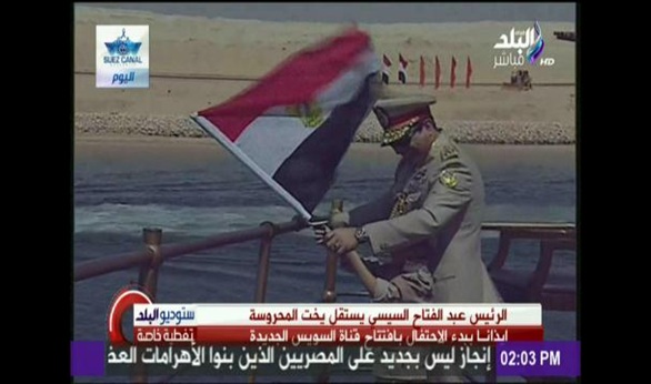 وكان قد وصل الرئيس عبد الفتاح السيسى إلى الإسماعيلية لإعطاء إشارة البدء، فى احتفالات قناة السويس الجديدة، وارتدى الرئيس الزي العسكري، وصعد على يخت "محروسة"، وتم عزف الموسيقى العسكرية.