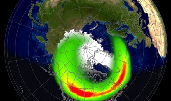 وتوضح الصورة المرفقة نشاط العاصفة "الجيومغناطيسية" صباح الاحد 16 اغسطس 2015 على القطب الشمالي للأرض