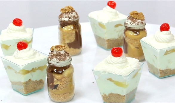اخلطي البسكويت مع الزبدة وضعي طبقة منه فى أسفل الأكواب ثم اضيفي شيكولاتة قابلة للدهن على الحليب المكثف المحلى المغلى وبدلي طبقات البسكويت والموز والحليب وعين الجمل وزينيه بالكريمة المخفوقة والشيكولاتة المبشورة.