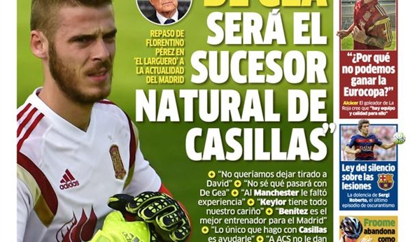 صحيفة "ماركا": "فلورنتينو بيريز يوضح قضية دي خيا في مقابلة تليفزيونية، بيريز يؤكد دي خيا سيكون الوريث الشرعي لكاسياس، اليونايتد يفتقد للخبرة، الفريق الأعلى قيمة بالعالم هو ريال مدريد مع كريستيانو، بيل وخيمس رودريجيز هو الفريق الأثمن بالعالم".