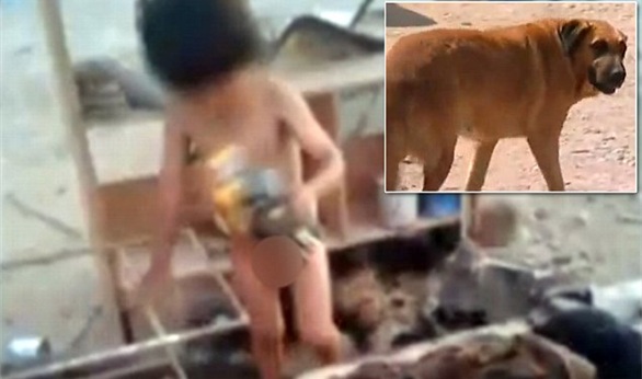 وشوهد الطفل الذي يبلغ من العمر عامين يرضع من ثدي الكلبة "رينا"، بعد أن تركته والدته المخمورة بدون طعام أو شراب في صحراء ميناء أريكا.