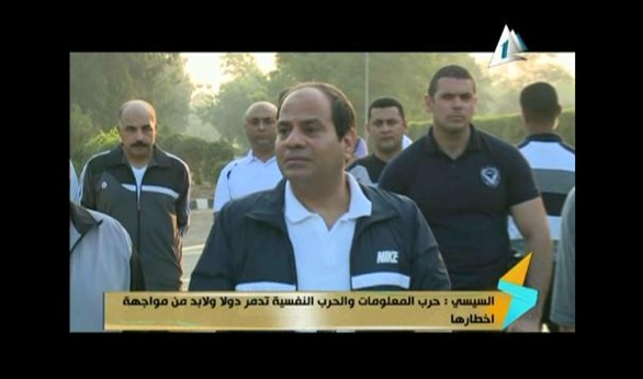 وظهر الرئيس عبد الفتاح السيسى مرتديا زيه الرياضي، يرافقه الفريق أول صدقى صبحى، وزير الدفاع والإنتاج الحربى القائد الأعلى للقوات المسلحة، والفريق محمود حجازى، رئيس الأركان، وعدد من طلبة الكلية الحربية.