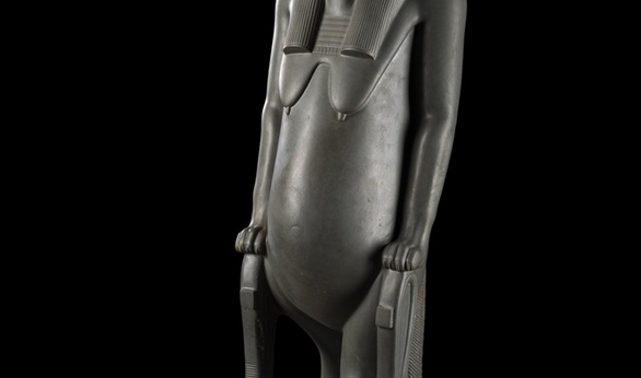 ويظهر التمثال وهو واقف يرتدي التاج الأزرق والنقبة المعتادة (الشنديد الملكي) متخذا وضع المشي، يمسك عصا في يده اليمنى، يوعتقد أن هذا التمثال لأحد ملوك الأسرة الثلاثين أو ربما هو الملك "بسماتيك الثاني" من الأسرة السادسة والعشرين وذلك وفقاً للكتابات الموجودة داخل الخرطوش الموجود على الحزام.