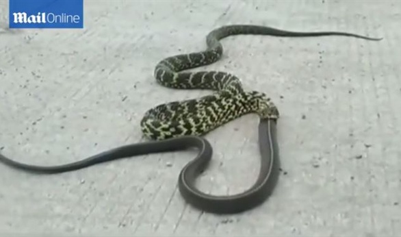 تداول رواد مواقع التواصل الاجتماعى فيديو التقطه مزارع صيني، يظهر معركة دامية انتهت بابتلاع أفعى صغيرة لأفعى أكبر وأطول منها، وتابع المزارع الصيني برعب المعركة الشرسة، حيث تغلبت الأفعى المرقطة، والتي يرجح أنها من نوع "أفعى الجرذان الملكية" على أفعى من نوع "الأفعى التايوانية"، وذلك بعد نحو 10 دقائق من القتال.