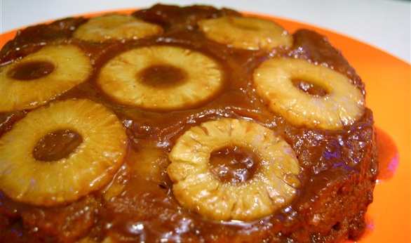 للأناناس وتخلط الزبدة مع السكر والدقيق وييُدهن بها قاع الصينية فقط وليس من الجوانب وترص حلقات الأناناس جنبا إلى جنب وتوُضع حبة كرز في منتصف كل حلقة أناناس ويصب الخليط فوق الأناناس ويساوى السطح.خبز في الفرن لمدة 30 دقيقة أو حتى تمام نضج الكيك و تتُترك لتبرد، ثم تقلب الصينية في طبق التقديم.