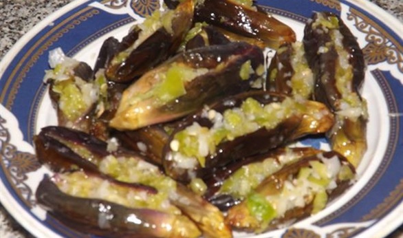 - يرص الباذنجان المسلوق في طبق التقديم ويُفتح من المنتصف (دون فصل الجانبين)، يحشى بكمية وفيرة من خليط الفلفل والثوم.