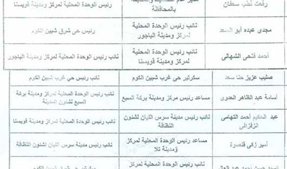 وتم نقل وطارق عبد المحسن عبد القادر رئيس مركز ومدينة اشمون الى رئيس مركز ومدينة الشهداء، وأشرف مليجي باظه مدير الموارد البشرية بالمحافظة الى رئيس لمركز ومدينة بركة السبع وأسامة عبد الظاهر العدوى مساعد رئيس مركز ومدينة بركة السبع الى نائب لرئيس المركز ، ورفعت قطب سعفان مديرعام التخطيط بالمحافظة الى رئيس للوحدة المحلية لمركز ومدينة قويسنا، وأحمد فتحي الشهالى نائب رئيس مركز ومدينة قويسنا الى رئيس مركز ومدينة الباجور، وصليب عزيز حنا سعد سكرتير حى غرب شبين الكوم الى نائبا لرئيس الحي، وإسلام عطيتو سكرتيرا لحي شرق والذي كان يشغل منصب مساعد رئيس الحي، ومجدي عبده ابوالسعد نائب رئيس مركز ومدينة الباجور الى رئيس حى شرق مدينة شبين الكوم واحمد متولي عبد السلام سكرتير الحي الى نائبا للرئيس والسيد حسن احمد عبد العال نائب رئيس مركز ومدينة بركة السبع الى سكرتيرا للحي، وعبد الحكيم احمد التهامي نائب رئيس مركز ومدينة قويسنا الى نائب لرئيس المركز والمدينة.