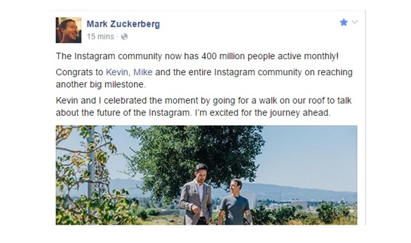 وكتب "زوكربرج" عبر حسابه الرسمي على فيسبوك مهنئا زميليه "كيفين سيستروم" و"مايك كريجر" (مؤسسا أنستجرام) بهذا الإنجاز، والذي يضاف إلى انجازات فيسبوك باعتباره مملوكا للشركة الشهيرة.