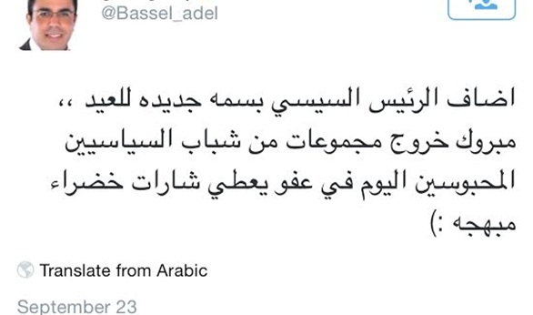 وقال عادل فى تدوينة له على موقع التواصل الإجتماعى "تويتر" : "مبروك خروج مجموعات من شباب السياسيين المحبوسين اليوم فى عفو يعطى شارات خضراء مبهجة".