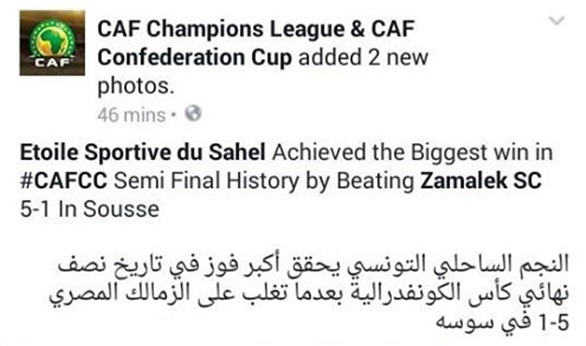 جاء ذلك عبر الصفحة الرسمية للاتحاد الأفريقي على موقع التواصل الاجتماعي فيس بوك وعلقت "النجم الساحلي التونسي يحقق أكبر فوز في تاريخ نصف نهائي كأس الكونفدرالية بعدما تغلب على الزمالك المصري 5-1 في سوسة".