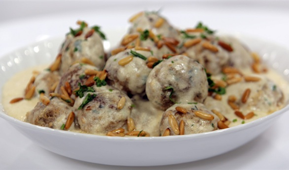أضيفي الكفتة الى الصوص وقدميها ساخنة مزينة بالصنوبر والبقدونس.