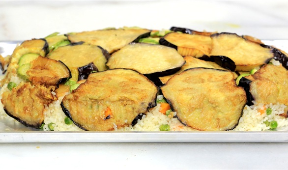 اتركى الأرز حتى تمام النضج رصى شرائح البطاطس والكوسة والباذنجان المقلى فى قالب