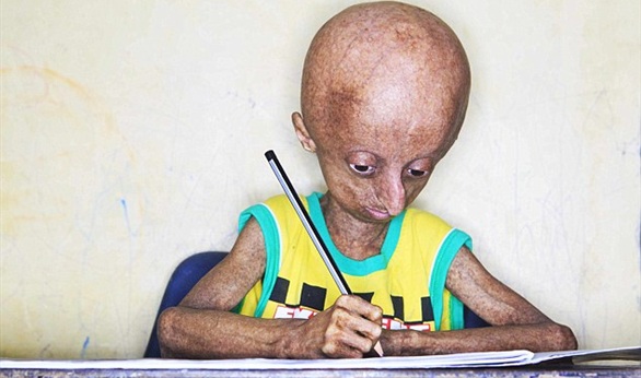 لكن بيتلا – 14 عاما- يعيش في جسد رجل عجوز مع جلد ممتلئ بالتجاعيد ورأس كبيرة صلعاء ويعاني من صعوبات في المشي والحركة.
