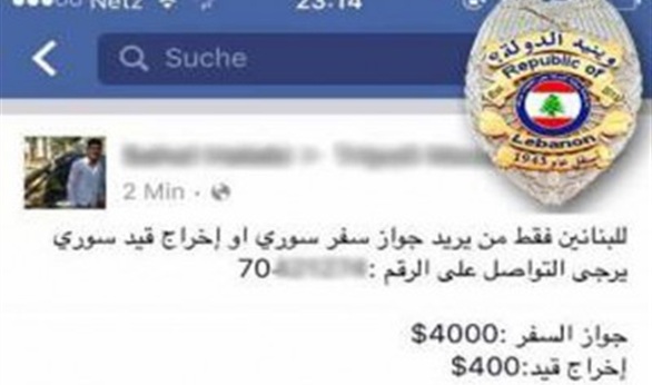 يعرض سوريون ولبنانيون عبر مواقع التواصل الاجتماعى "فيسبوك" جوازات سفر سورية للبيع بمبلغ 4000 دولار؛ كما يباع مع جواز السفر "القيد" الذي يجعل الجواز أصليا وغير مزور وهو ما يترتب عليه تكلفة إضافية تصل لـ400 دولار.
