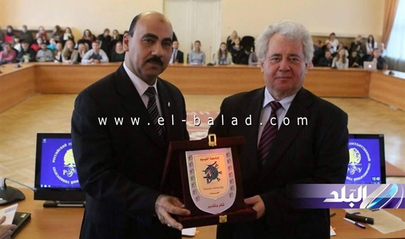 أهدى الأستاذ الدكتور خالد إسماعيل حمزة رئيس جامعة الفيوم، "ب إ ناسيفافيتش" رئيس جامعة موسكو للعلوم الانسانية، درع الجامعة، تقديرًا لدوره فى زيادة التعاون الثقافي المصري الروسي والتبادل العلمى بين البلدين.