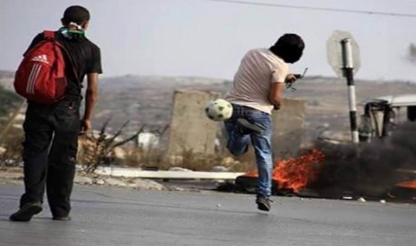 مارس مجموعة من الشباب الفلسطينيين لعب كرة القدم أثناء اشتباكهم مع جنود
