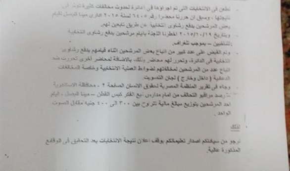 واستند "الشناوي" في طعنه على تقرير المنظمة المصرية لحقوق الإنسان، بالإضافة إلى المحضر الذي حرره "6405 لسنة 2015 إداري مينا البصل" والذي أثبت فيه توزيع رشاوي انتخابية من خلال تابعين لأحد المرشحين، مطالباً اللجنة بوقف إعلان نتيجة الانتخابات عن دائرته لحين التحقيق في الوقائع المذكورة.