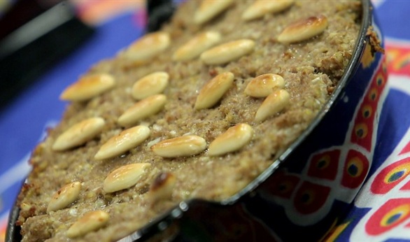 استمرى فى التشويح حيتى يتغير لون اللحمة الى البنى ضيفى دبس الرمان اليها و الصنوبر و استمرى فى التقليب لمدة 3 دقائق اخرى ترش الصينية بالزيت ثم تفرد نصف كمية الكبة ثم الحشو ثم باقي الكبة و يرش اللوز من فوق مع زيت زيتون ثم تدخل الفرن لمدة 15 الى 25 دقيقة و تقدم بالهنا.نقدم لك طريقة تحضير الكبة في الصينية للشيف أميرة شنب.