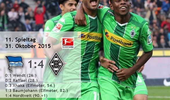بهذه النتيجة رفع مونشنجلادباخ رصيده إلى 18 نقطة , بينما توقف رصيد هيرتا برلين عند 17 نقطة .سحق بروسيا مونشنجلادباخ مضيفه هيرتا برلين بأربعة أهداف مقابل هدف واحد فى المباراة التى أقيمت اليوم السبت على الملعب الأولمبي ببرلين، ضمن منافسات الجولة الحادية عشرة من مسابقة الدورى الألماني الممتاز لكرة القدم .