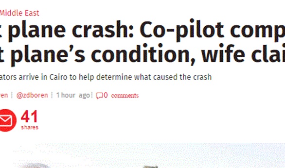 نقلت صحيفة "الاندبندنت" البريطانية عن زوجة مساعد طيار الطائرة الروسية المنكوبة بوسط سيناء، قولها إن زوجها تذمر عدة مرات بسبب ظروف الطائرة المنكوبة؛ مشيرة إلى أن الطائرة الروسية التى تحطمت فوق صحراء سيناء وتحمل على متنها 224 مسافرًا كانت تعانى "مشاكل فنية خطيرة" قبيل إقلاعها.