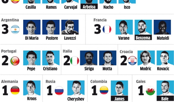 وتضم التشكيلتان لاعباً من كولومبيا هو خاميس رودريجيز من الميرنجي ، ولاعباً من ويلز هو جاريث بايل نجم الريال ، وآخر من المانيا هو توني كروس من الريال أيضاً وآخر من روسيا هو شيريشيف من الميرنجي ، والحارس الكوستاريكي كايلور نافاس لاعب ريال مدريد.